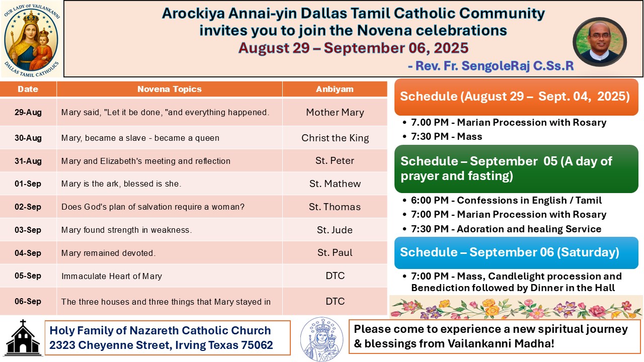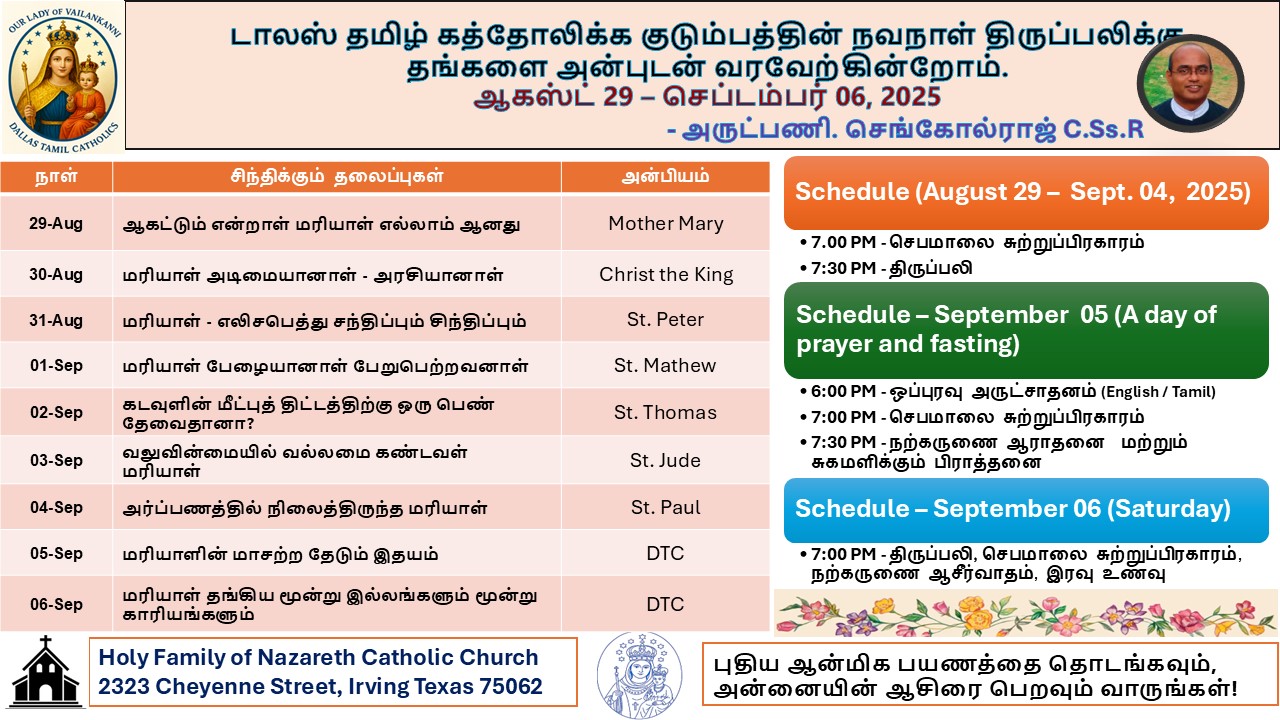 9 day novena celebrated every year during August / September with Rosary, Arockia Matha car procession, Mass in Tamil, Eucharistic Adoration and Social Events .